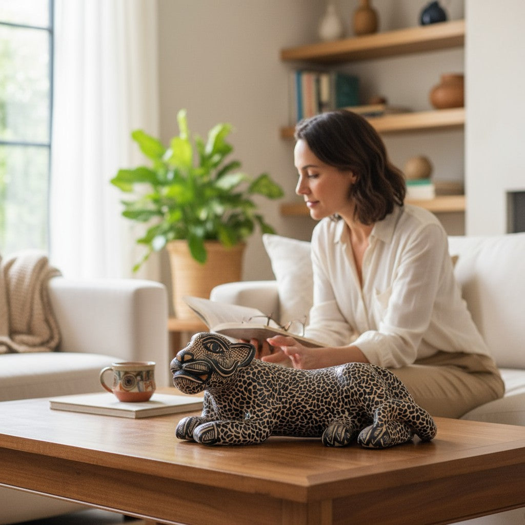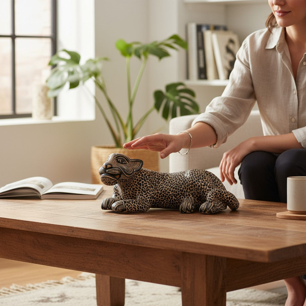 The jaguar symbolizes strength, protection, and intuition—a sacred guardian in Mayan tradition. Made with natural clay and wood-fired for its unique finish, every figure is one-of-a-kind.